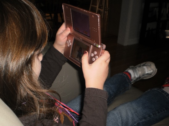 | Playing DS. We still can't figure out how to change the baby's diaper! |